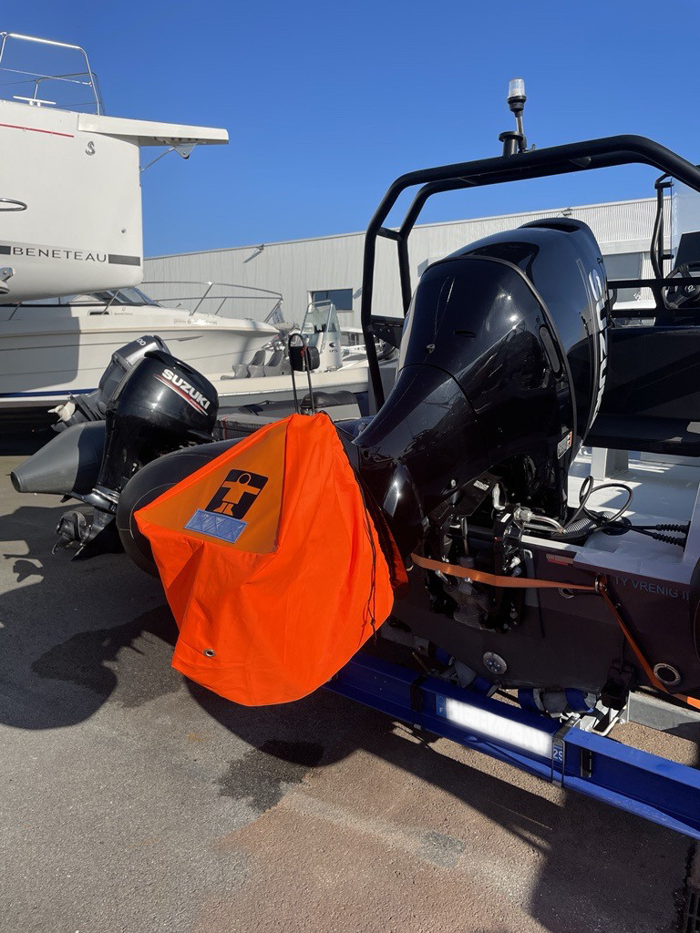 Housse étanche pour embase moteur orange fluo permettant une bonne visibilité.